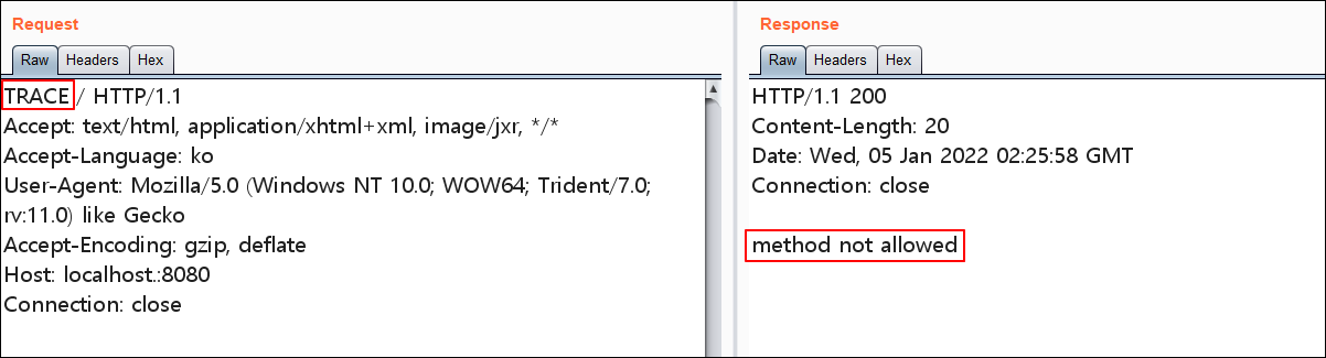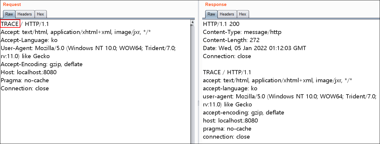 일단 서버 띄우면 디폴트로 1) OPTIONS, TRACE 활성화 되어있고 2) TRACE 전송시에도 응답값에 Allow 메소드 리스트 뜬다