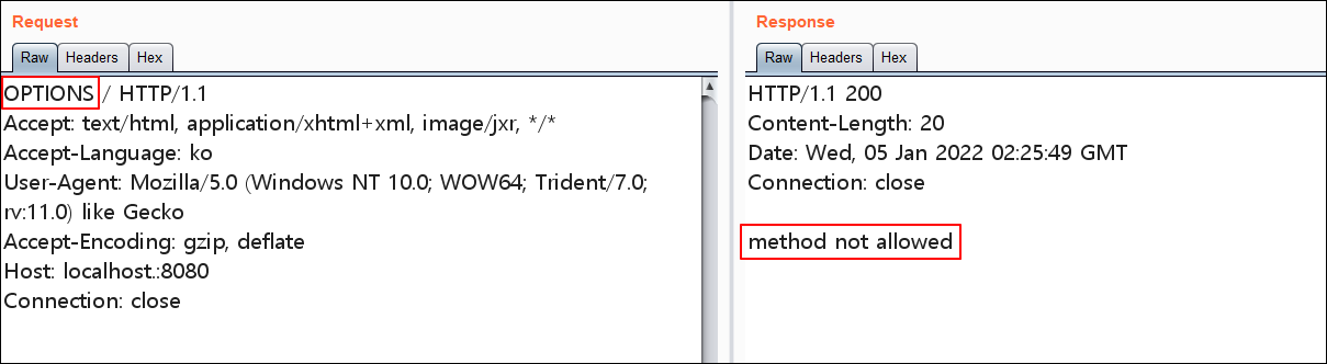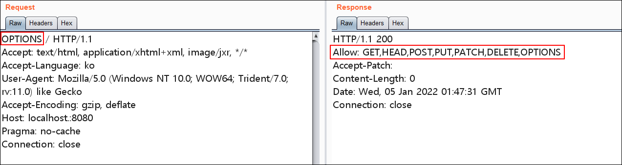 1) OPTIONS 활성화 되어있어 Allow 메소드 리스트 노출됨