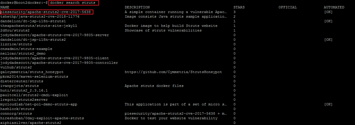 리스트 중 첫번째 이미지(piesecurity/apache-struts2-cve-2017-5638)를 다운받기로 함