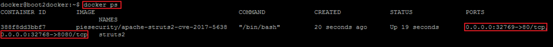 struts2 라는 컨테이너 생성되었으며 80포트는 32769포트에, 8080포트는 32768포트에 매핑된 것 확인할 수 있음