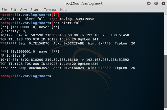 /var/log/snort 위치에서 cat alert.full 으로 파일 확인 시 탐지 결과 2건 확인 가능