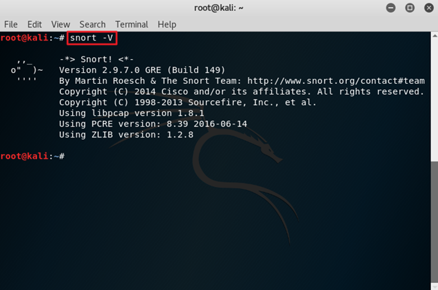 apt-get install snort 로 설치하고 snort -v 로 확인