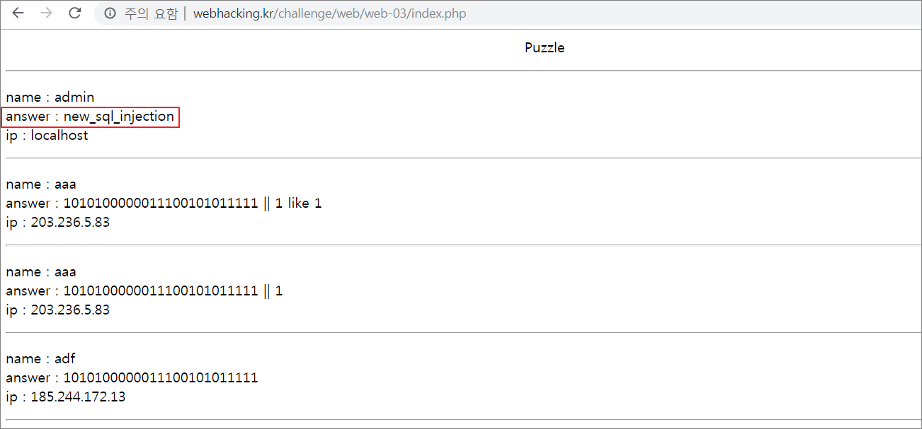 select answer, name, ip from table where answer=10101000... name=aaa and ip=203.236.5.83