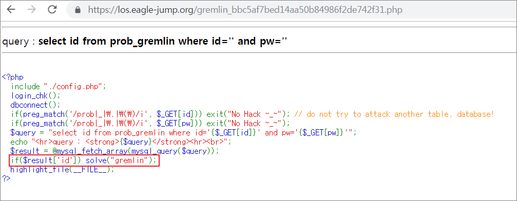 if($result['id']) solve("gremlin"); 라고 되어있는데
