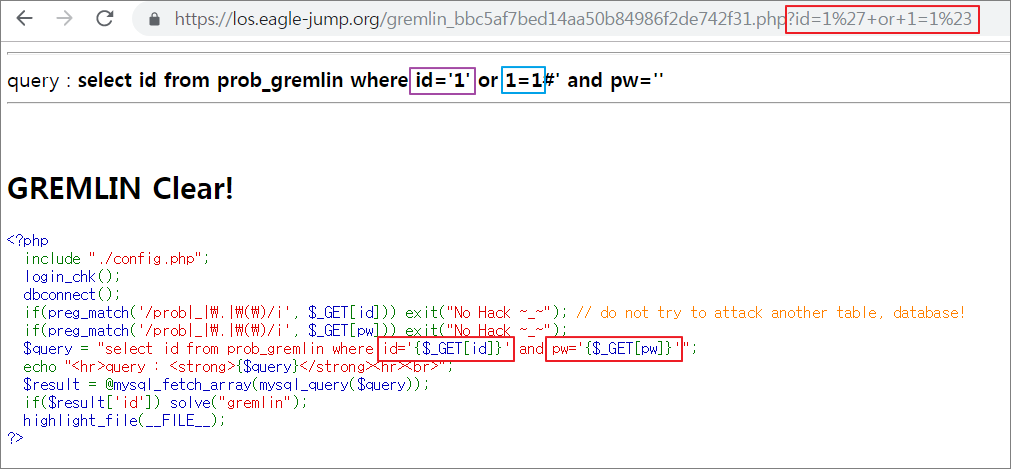 id=1' or 1=1# 하면 전체 쿼리는 참이 되어 GREMLIN Clear!