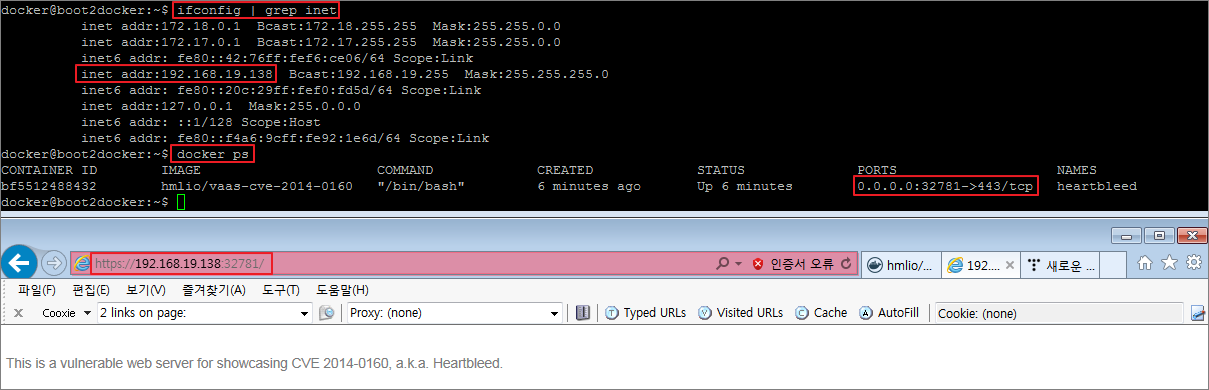 $ docker run -it -d -P --expose="443" --name heartbleed hmlio/vaas-cve-2014-0160 /bin/bash : 컨테이너 생성