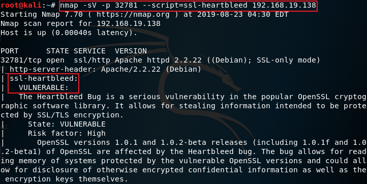 nmap -sV -p 32781 --script=ssl-heartbleed 192.168.19.138 : nmap 스크립트로 취약여부 확인