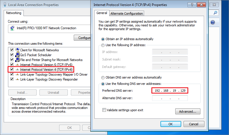 DNS를 AD 서버 IP(192.168.19.129)로 설정