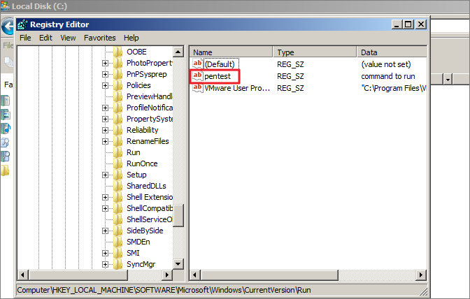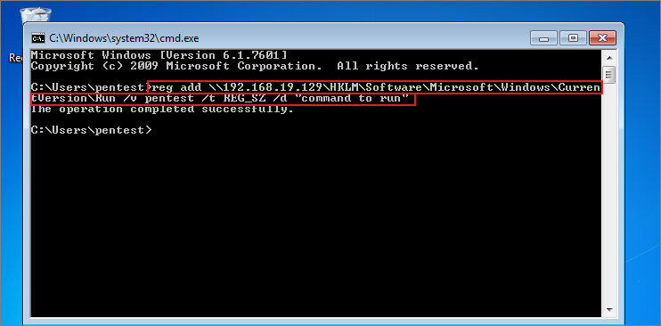 reg add \\192.168.19.129\HKLM\Software\Microsoft\Windows\CurrentVersion\Run /v pentest /t REG_SZ /d "command to run"